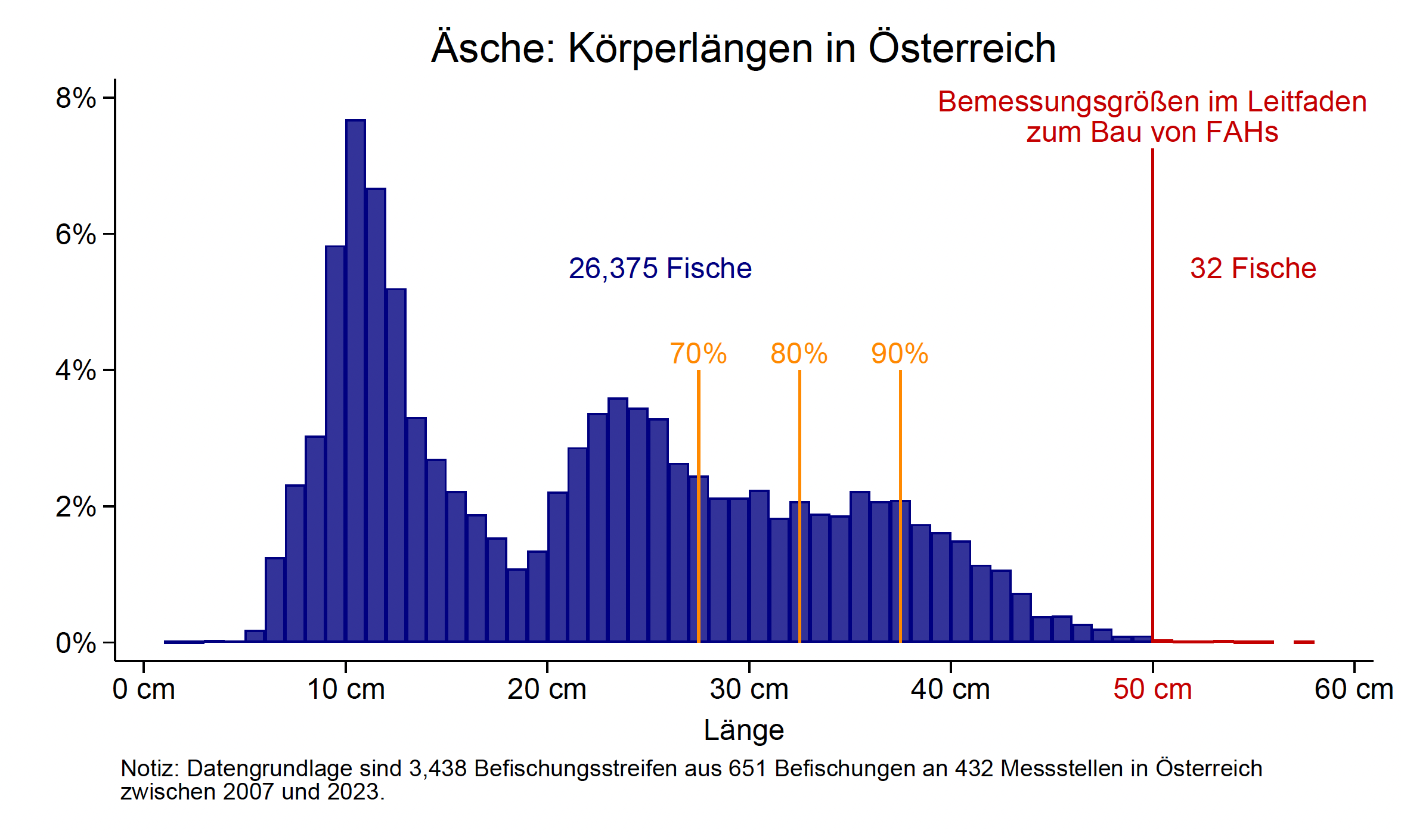 „Die Analyse aller im BAW-IGF vorhandenen Daten für die Fischart Äsche führte zur Empfehlung, die geforderte Nachweisgröße für den Stand-der-Technik der Fischart Äsche mit 40 cm festzulegen. Der erfolgreiche Aufstieg eines Individuums dieser Größe wird als qualitativer Beleg für einen ausreichend großen Passagekorridor für mehr als 95% der Gesamtpopulation im Metarhithral und annähernd 100% in Hyporhithral klein angesehen.“